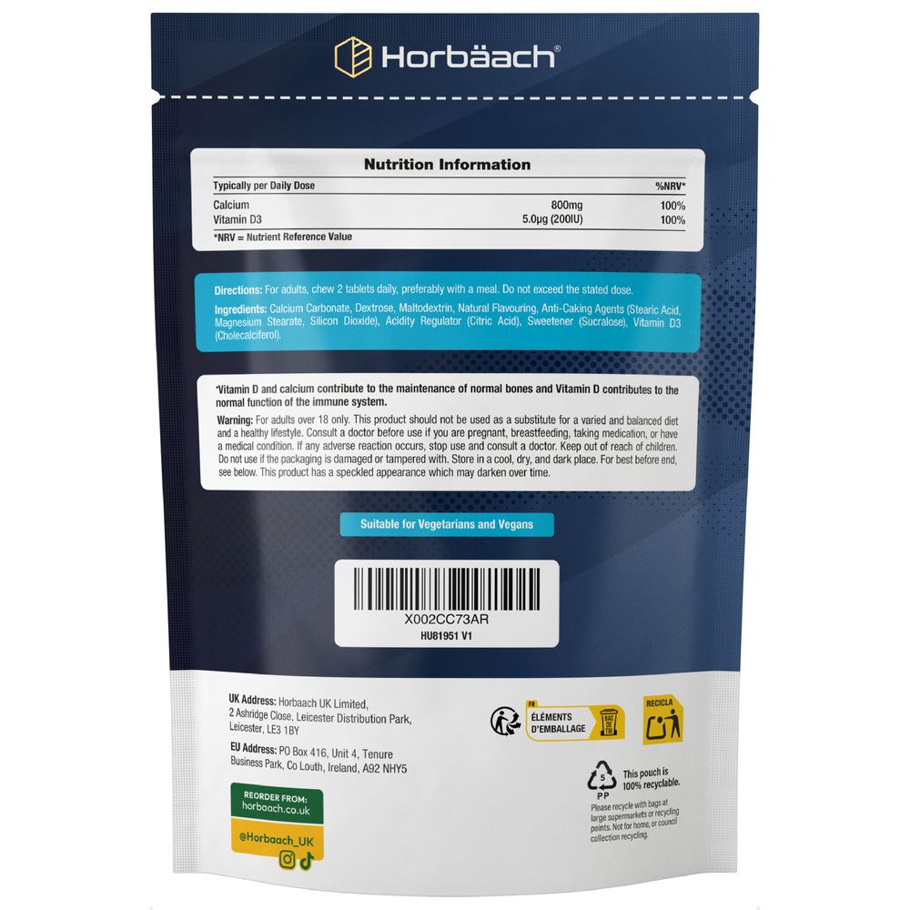 Step up your daily nutrition with Horbaach Calcium & Vitamin D3. This innovative formula is designed to work in harmony, ensuring that you get the most out of each essential nutrient. This innovative formula delivers an ultra high dose of 800mg Calcium & 200iu Vitamin D3 in a convenient chewable tablet formula. Simply chew two tablets daily and reap the benefits for over 2 months.