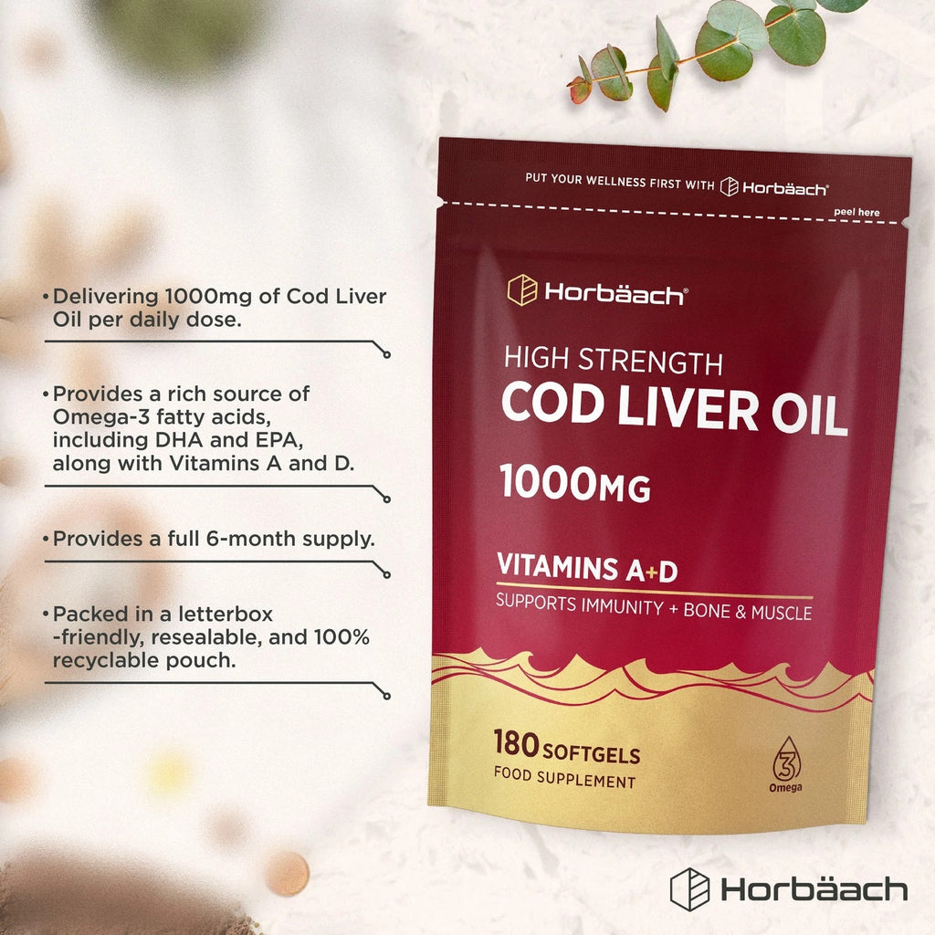 Horbaach Cod Liver Oil provides 1000 mg of Cod Liver Oil per serving, enhanced with added Vitamins A and D3. Take one easy-to-swallow softgel daily as part of your regular supplement routine, and reap the benefits of this supplement!