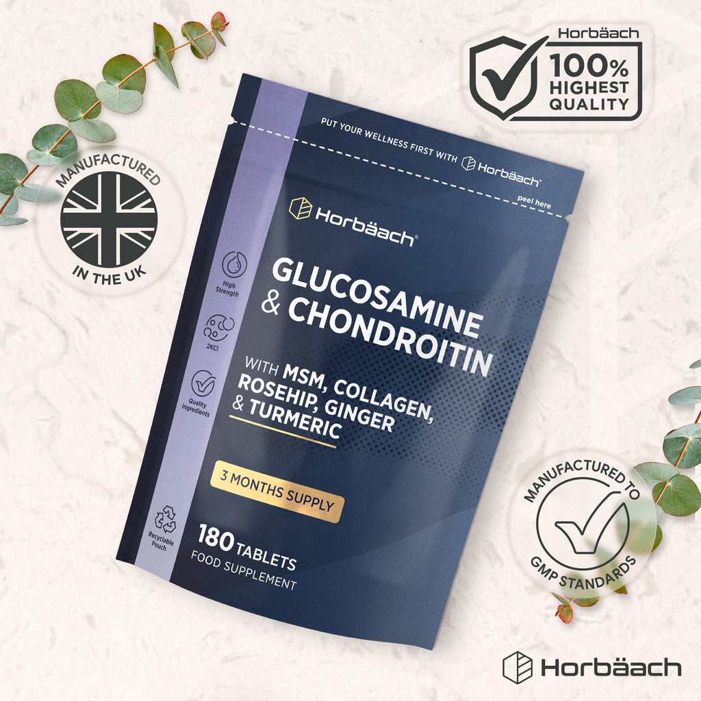 Horbaach Glucosamine & Chondroitin High Strength Complex combines Glucosamine Sulphate, Chondroitin, Collagen, MSM, Ginger Root, Turmeric, and Rosehip Extracts — a synergistic blend of ingredients that work together to enhance their overall benefits. Simply take two (2) tablets daily and experience the difference this expertly balanced formula can make.