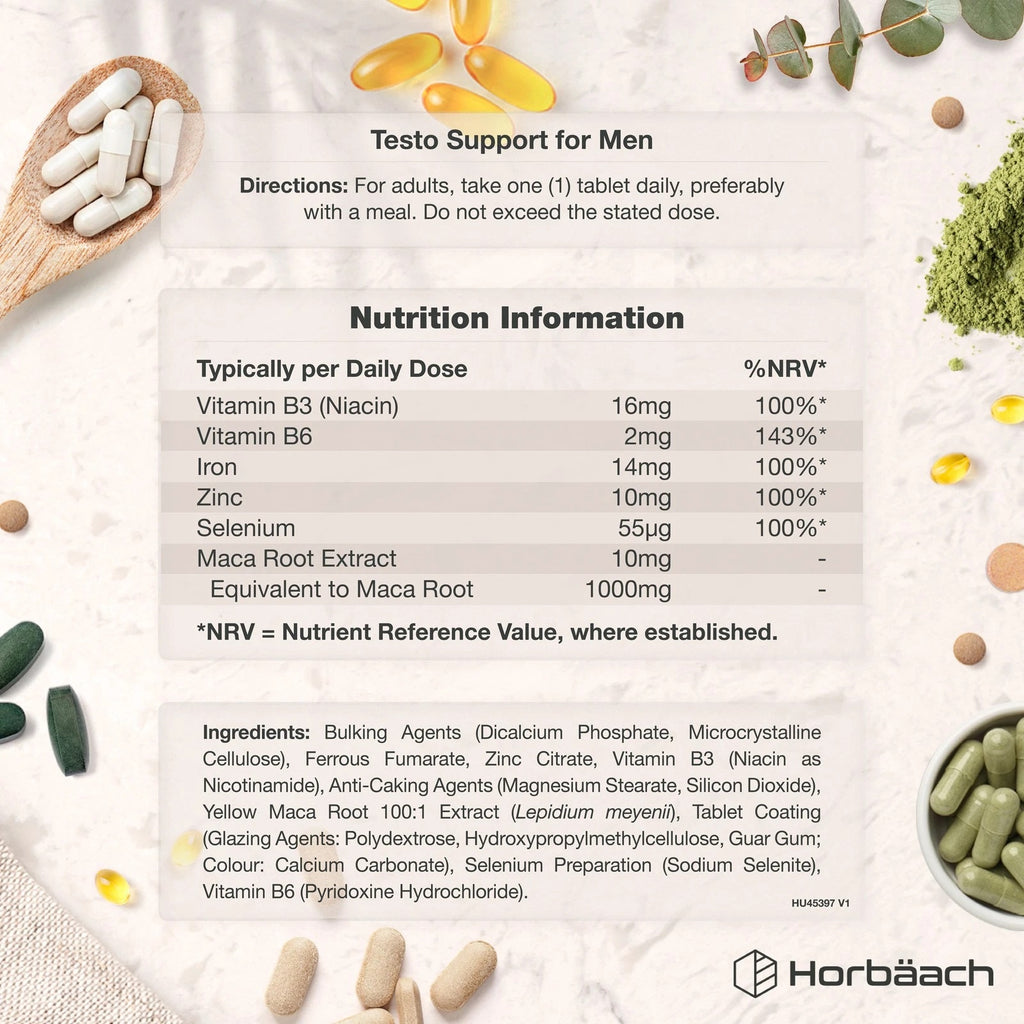 Step up your nutrition with Horbaach Testo Support for Men. Designed with men’s wellness in mind, this complex supplement combines carefully selected ingredients including essential vitamins, minerals, and botanicals. Simply take one (1) tablet a day and reap the benefit of this supplement for 4-months!