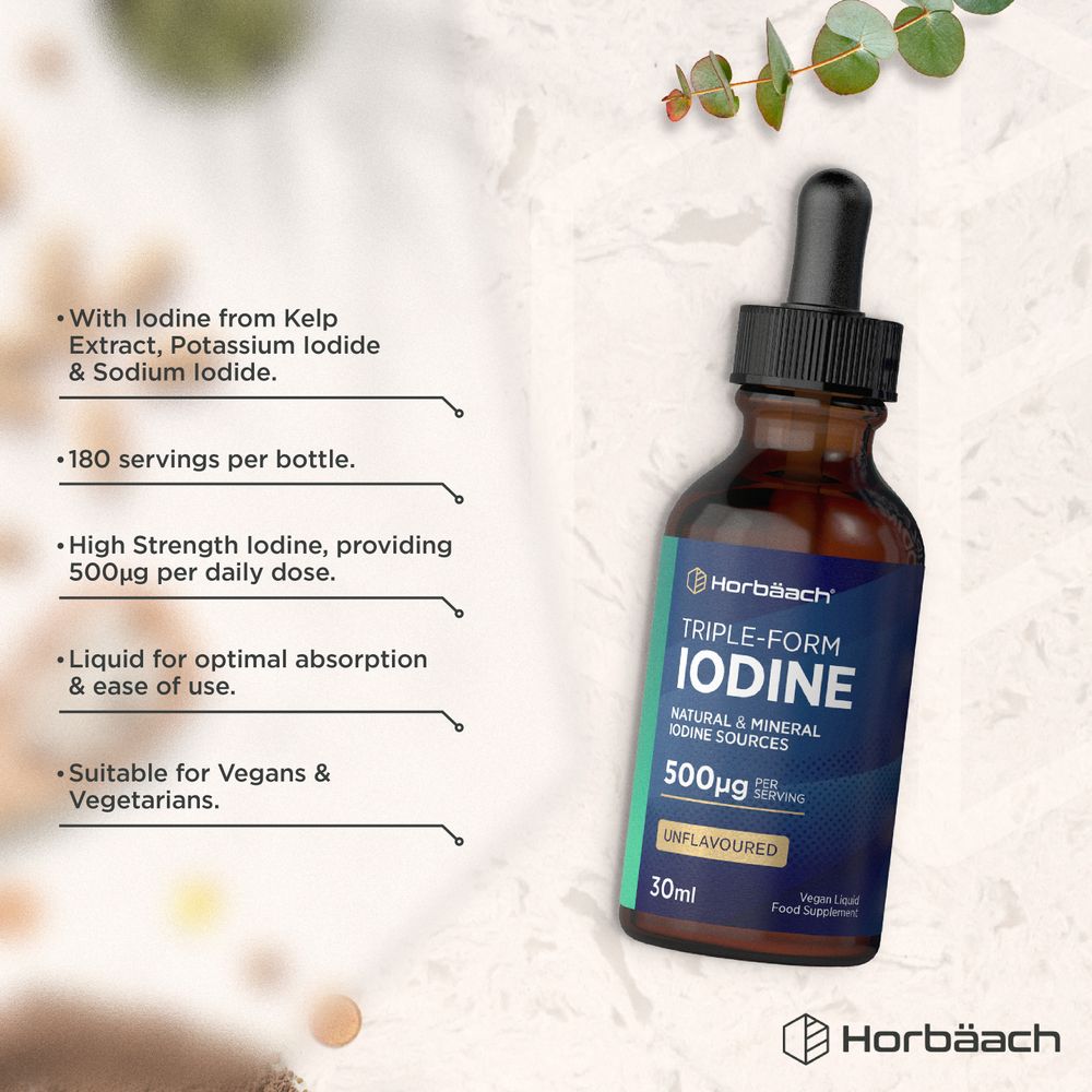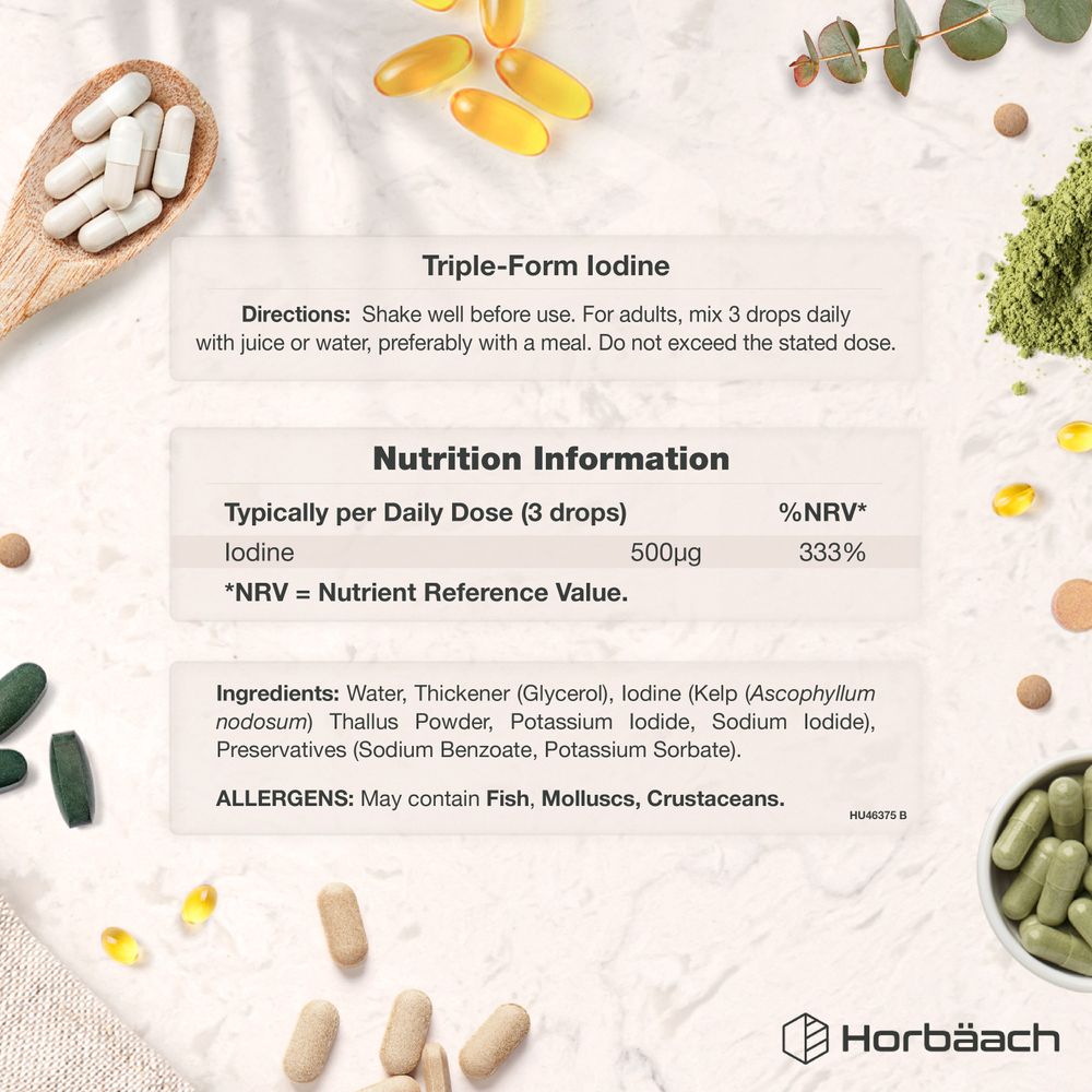 Elevate your daily wellness with Horbaach Iodine! This advanced formula provides 500 mcg of iodine per serving in an easy-to-use liquid drop format. Just three drops a day can help you unlock the incredible benefits of this essential mineral.