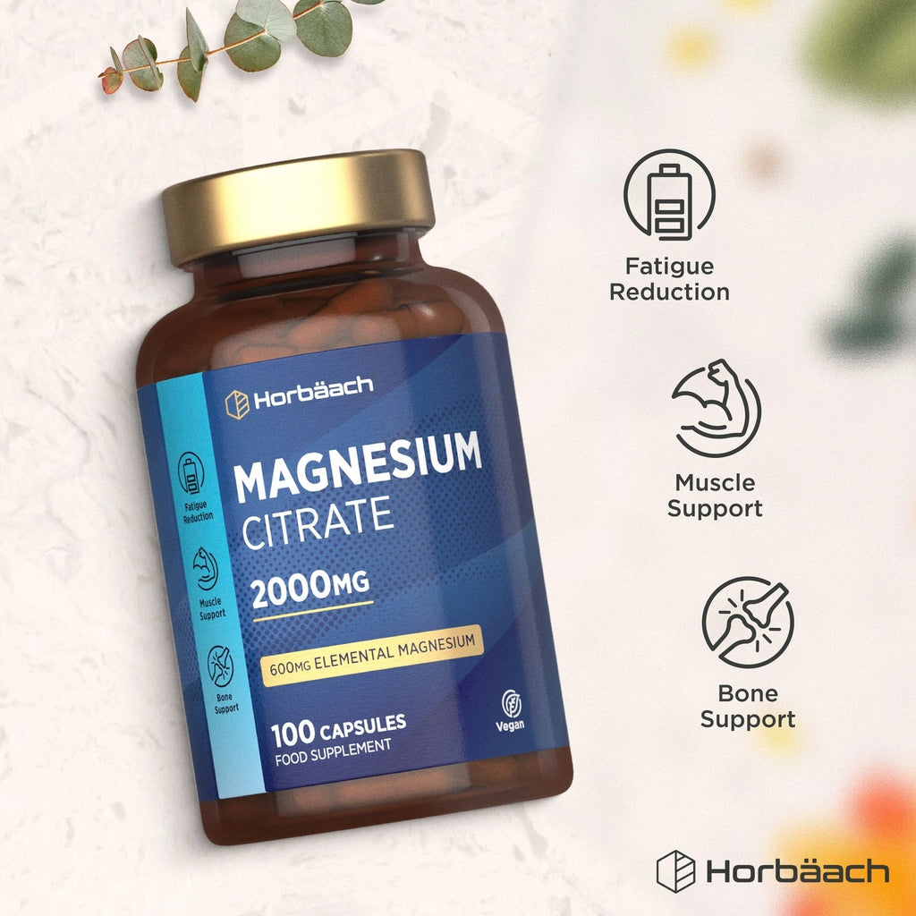 Elevate your daily health routine with Horbaach Magnesium Citrate, a premium supplement designed for maximum efficiency and convenience. Our advanced formula delivers 2000mg of Magnesium Citrate, providing an impressive 600mg of Elemental Magnesium in just three easy-to-take capsules.