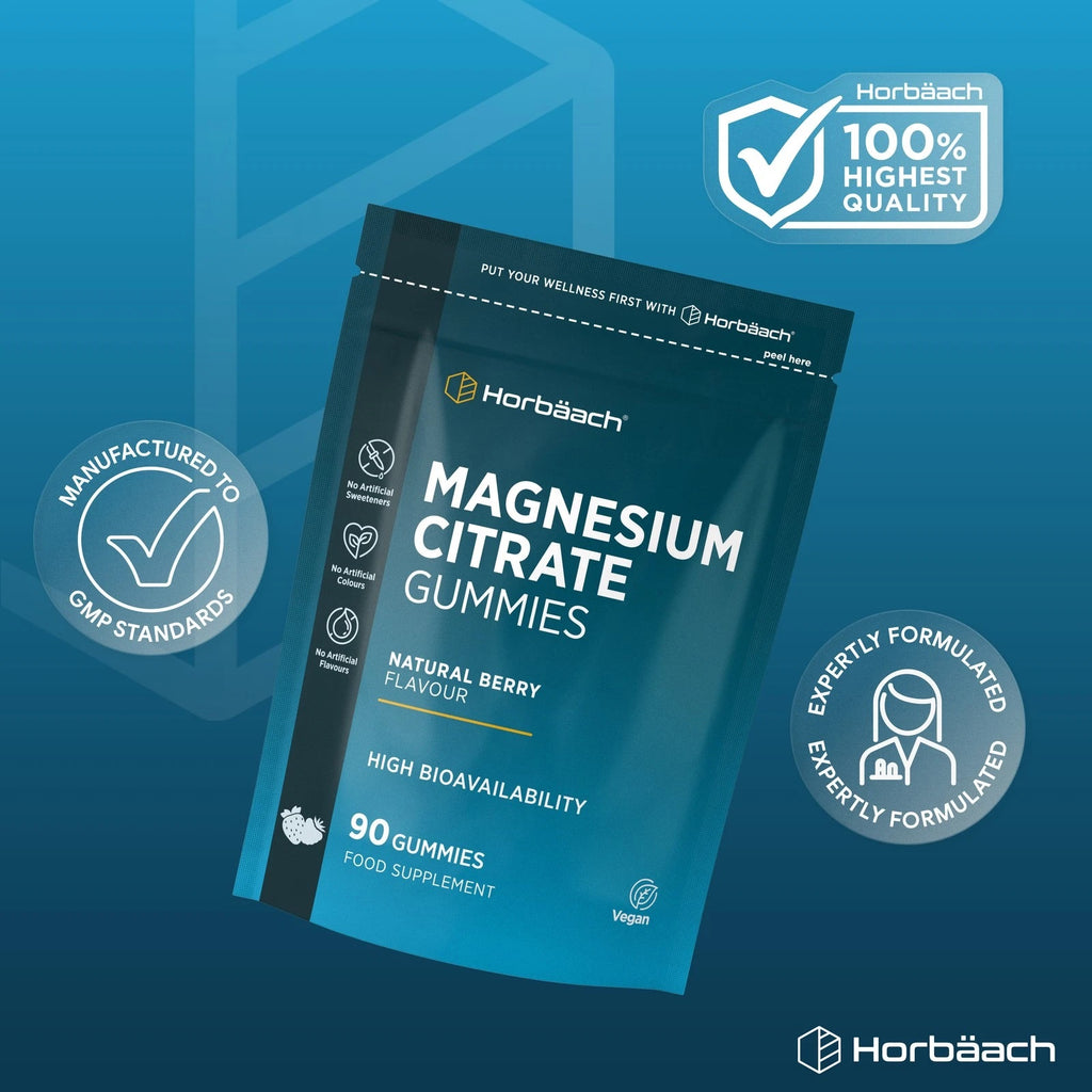 Step up your daily nutrition with Horbaach Magnesium Citrate. This advanced formula delivers 1600mg of Magnesium Citrate, providing 180mg of elemental magnesium in every serving. Just two delicious gummies, taken day or night, offer a convenient and effective way to support your health.