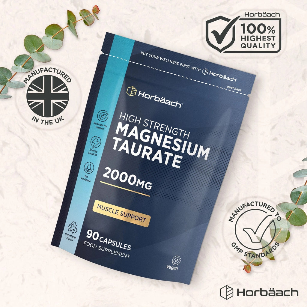 Step up your daily nutrition with Horbaach Magnesium Taurate. The daily dose provides 2000mg of Magnesium Taurate providing 160mg of Magnesium. Take four (4) capsules daily with a drink and reap the benefits of this extra-strong, natural mineral.