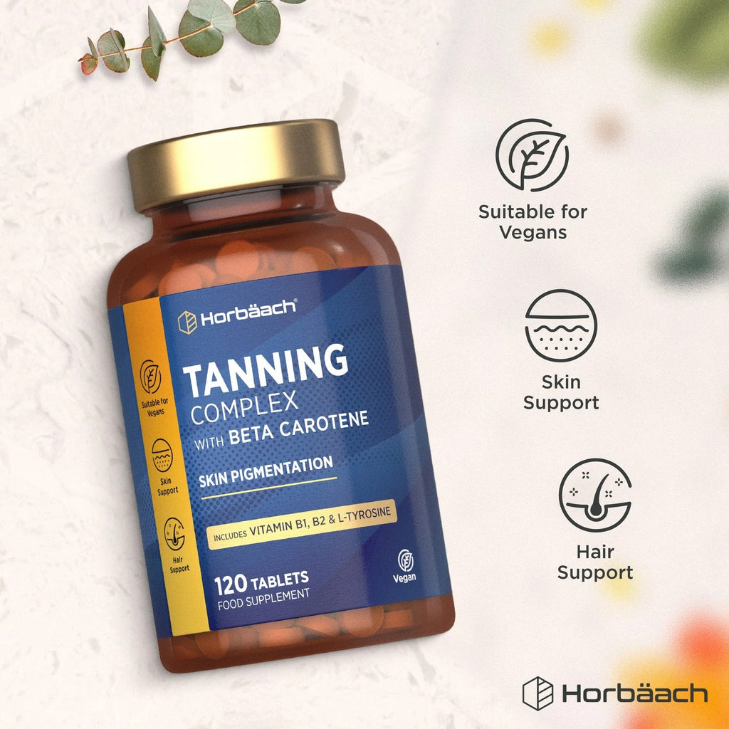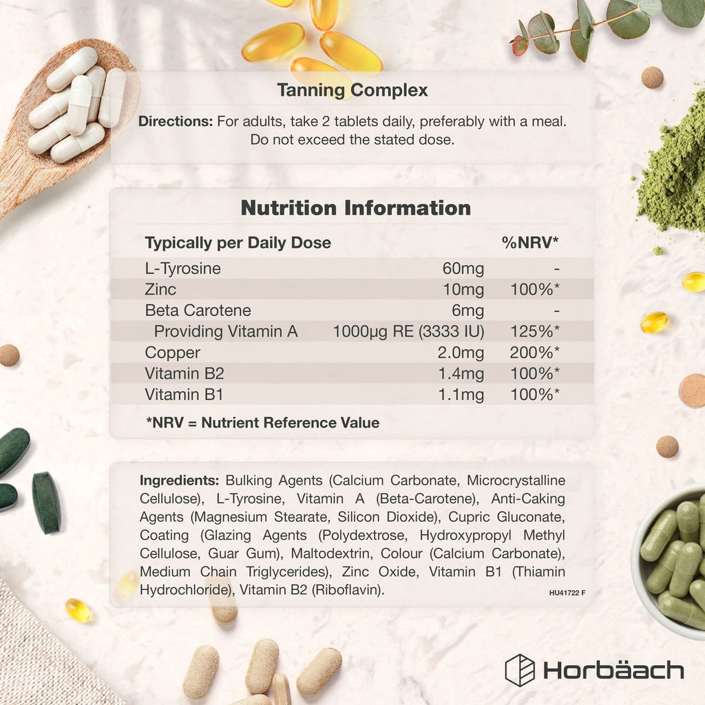 Get ready for your sun-soaked holiday with Horbaach Tan Tablets, expertly formulated with powerful carotenoids and key ingredients that enhance your skin's natural tanning process. Packed with L-Tyrosine, Beta Carotene, Copper, Zinc, and Vitamins B1 & B2, these tablets offer a simple yet effective way to support your tan. Just take two tablets daily and enjoy the long-lasting benefits of this high-quality supplement for over two months.