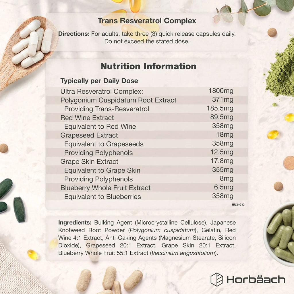 Step up your daily nutrition with Horbaach Trans-Resveratrol Complex. This highly innovative formula delivers 1800mg per daily serving. Formulated with added Grapeseed, Grape Skin, and Red Wine Extract for a natural boost. Simply take three (3) capsules a day as part of your wellness routine.