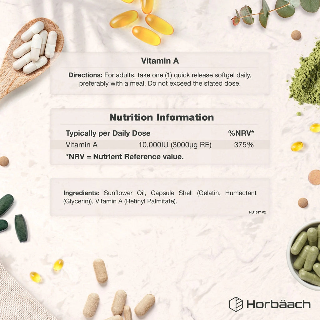 Each Horbaach Vitamin A softgel provides high strength 10,000 IU (3000 μg) of vitamin A in a convenient, one-a-day capsule.
