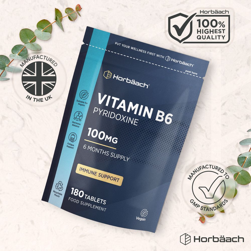 Horbaach Vitamin B6 provides 100 mg per tablet, offering a convenient way to include this nutrient as part of your daily routine. Simply take one easy-to-swallow tablet daily as directed.